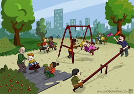 In the middle there is a boy pushing the girl in the swing. Behind the swing there are two girls sitting