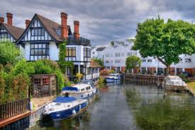 In the midle there is a river . There are four boats , two in the foreground and the other two are behind on the right hand and the other behind . To the left of the river there is a house and lot of brushes . In the middle on the right hand there is a tree.